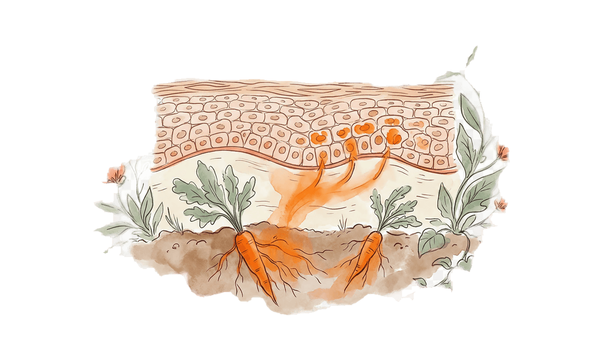 As a lipid-soluble molecule, beta-carotene integrates into cell membranes where it scavenges peroxyl radicals and prevents lipid peroxidation chain reactions. This is particularly relevant in the epidermis, where UV-generated free radicals cause cumulative membrane damage.