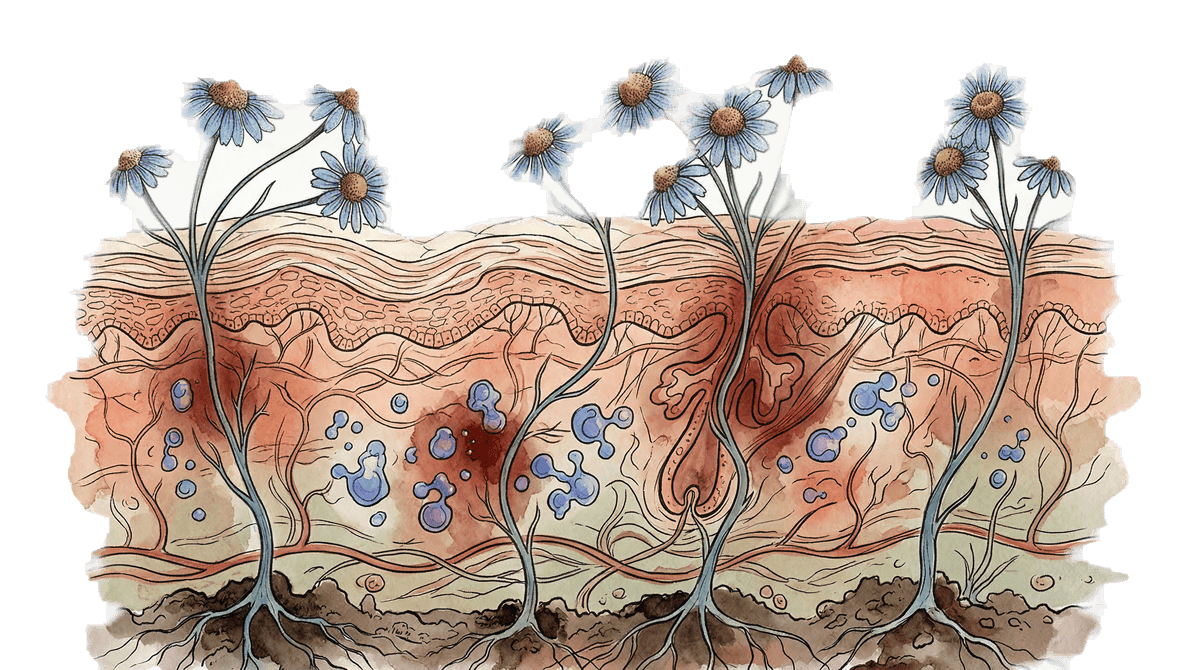 The blue color typically comes from guaiazulene or azulene, related compounds derived from chamomile. The blue is not an added dye. It is the natural color of the molecule, caused by the way its ring structure absorbs light. If a product is blue and lists guaiazulene or azulene as an ingredient, the color indicates the active ingredient is present.